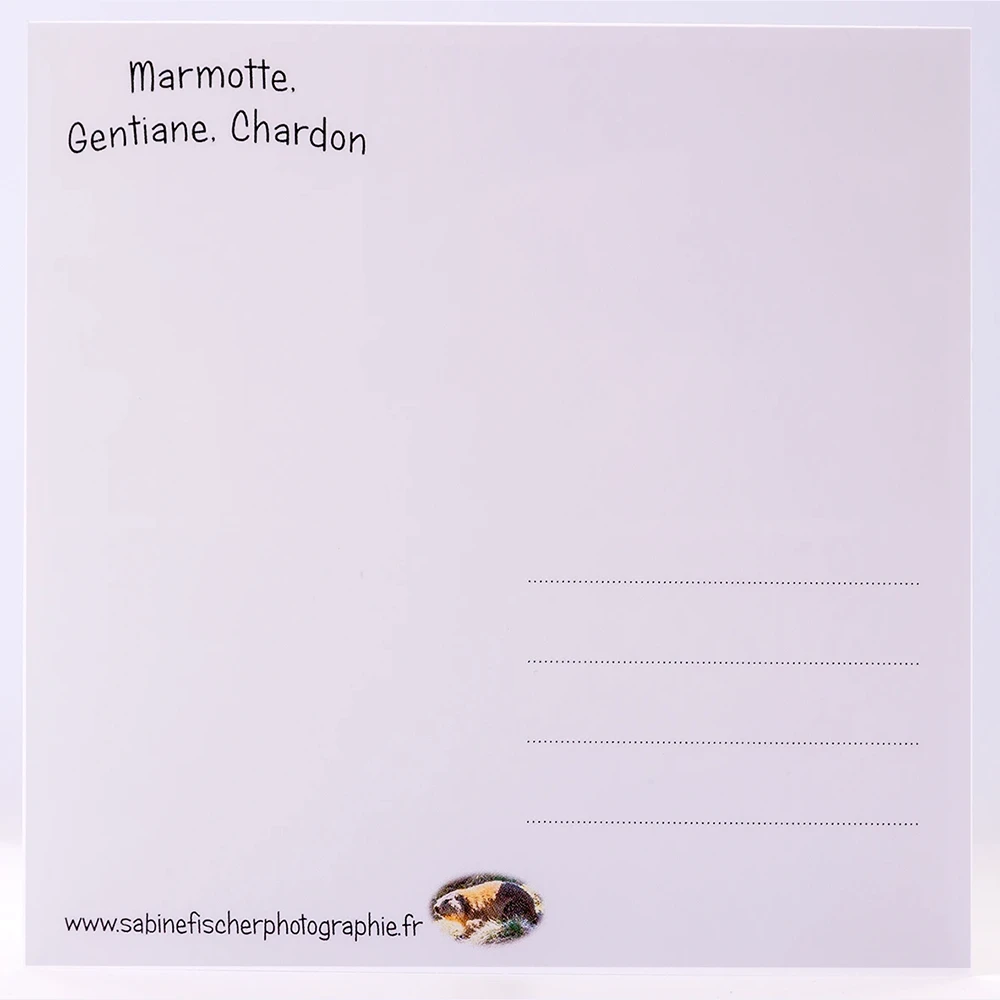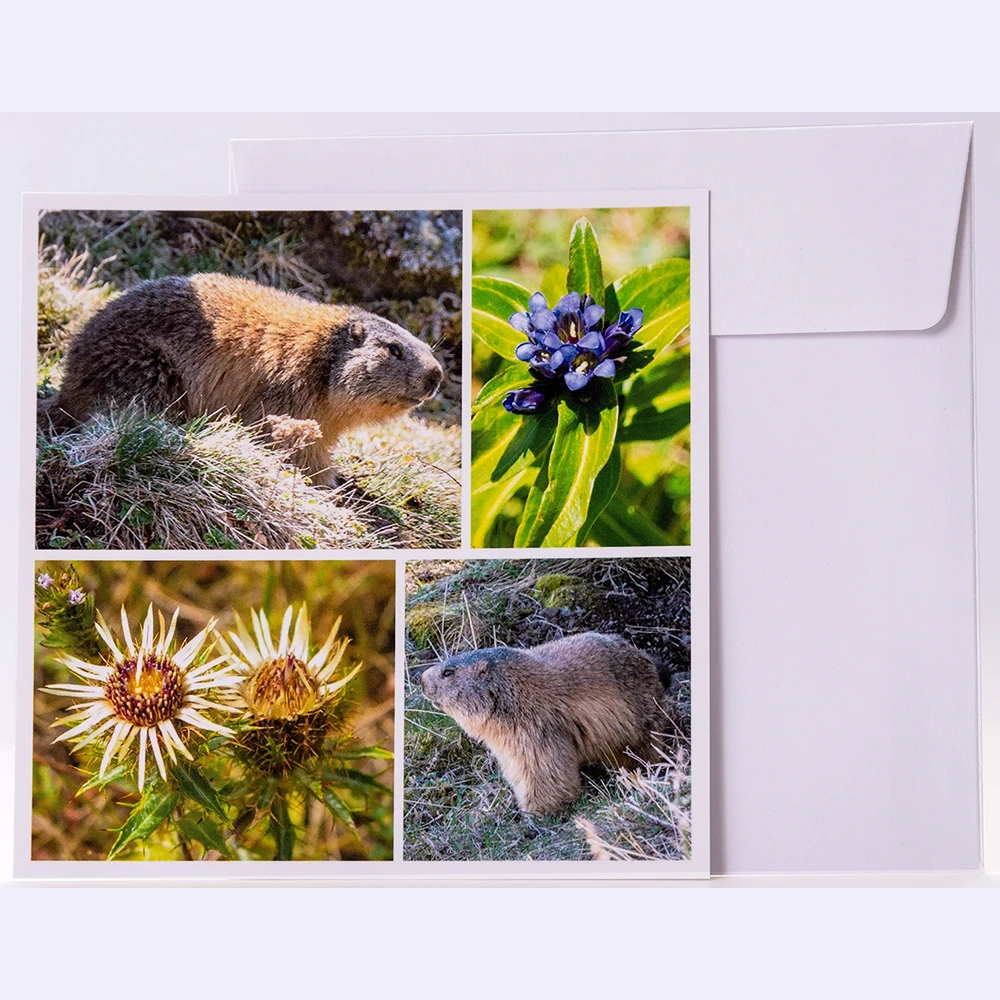 Carte postale nature carrée, 13 x 13 cm avec enveloppe blanche 14 x 14 cm, finition brillante – animaux & fleurs de la nature : marmottes, gentiane et chardon, inspirée et créée à partir de photographies prises au fil de randonnées en Ardèche.