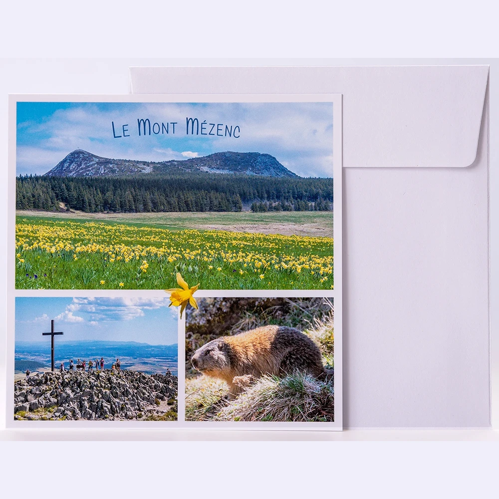 Carte postale paysage & nature – Le Mont Mézenc, la croix d’un des sommets et une marmotte, inspirée et créée à partir de photographies prises au cours de promenade sur le plateau Ardéchois.