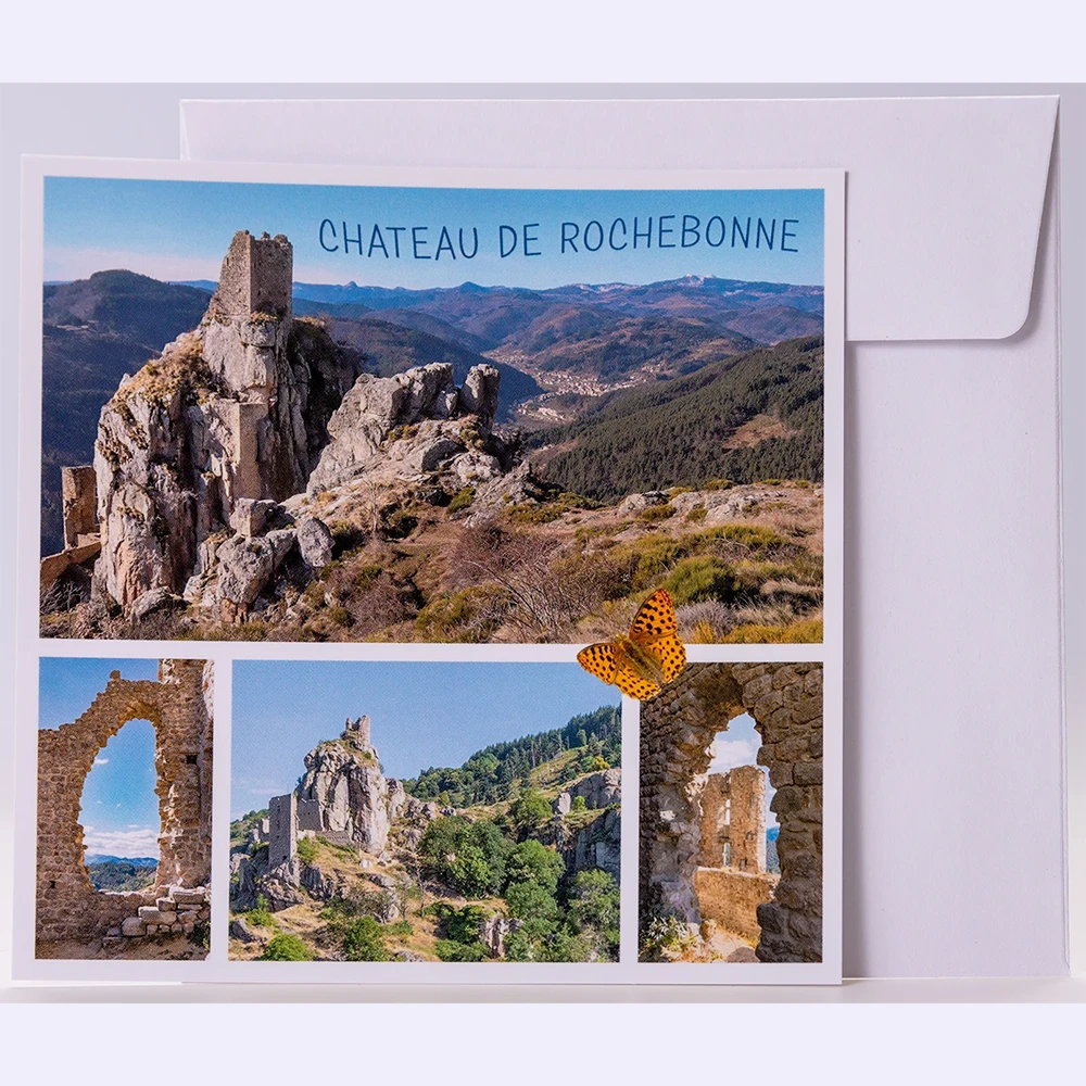 Les ruines du château de Rochebonne surplombent le village de Saint Martin de Valamas dans Les Boutières et offrent une vue sur les monts Ardéchois. Une carte à envoyer ou offrir ou conserver comme souvenir de vos vacances.