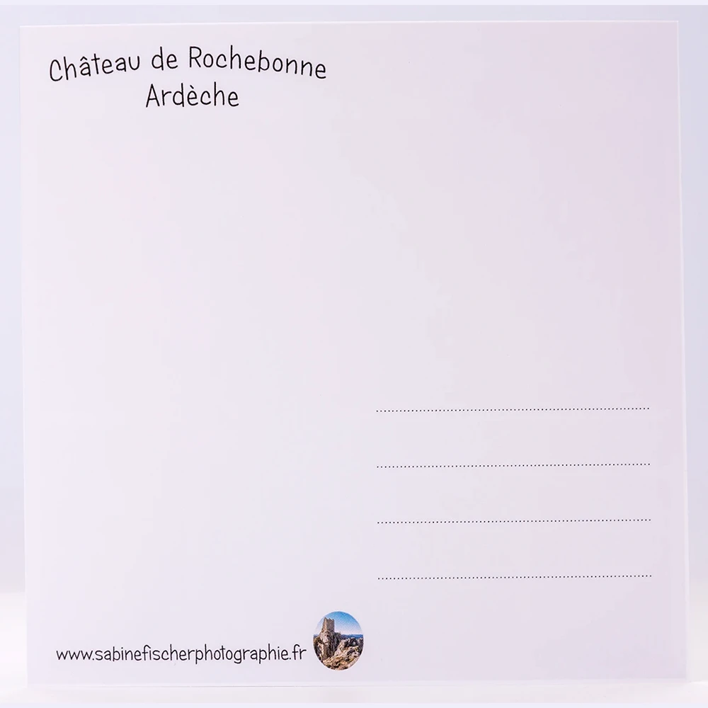 Carte postale carrée : 13 x 13 cm avec enveloppe blanche 14 x 14 cm, finition brillante.