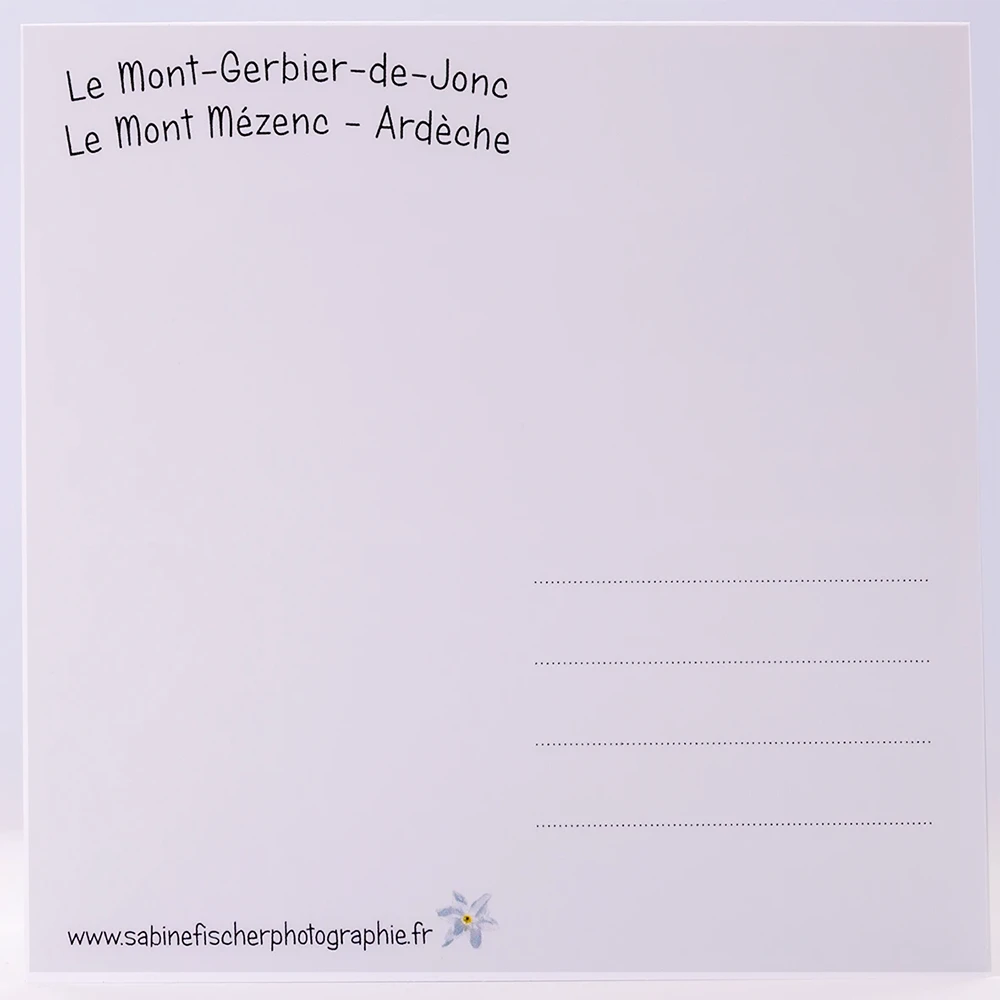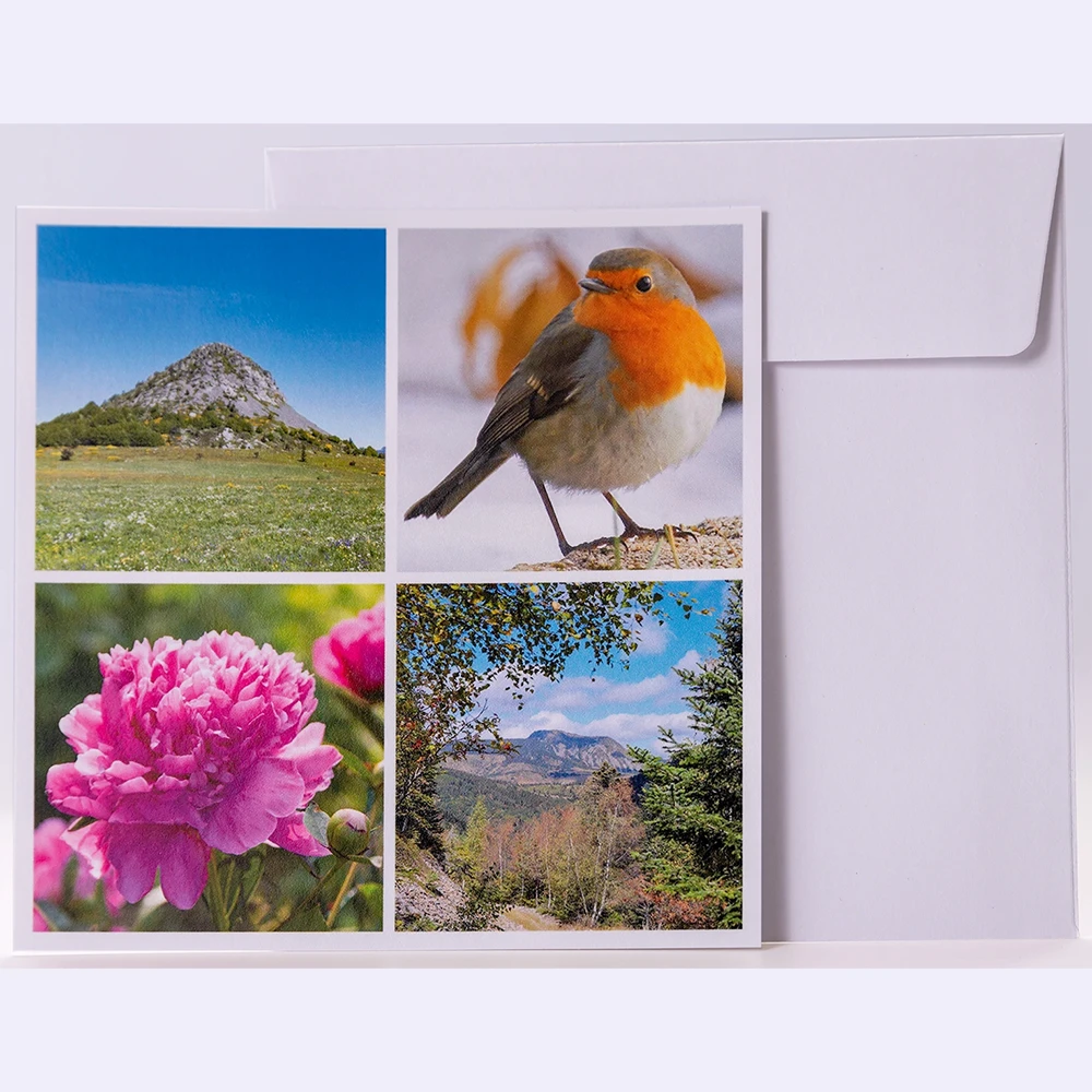 Carte postale carrée : 13 x 13 cm avec enveloppe blanche 14 x 14 cm, finition brillante.