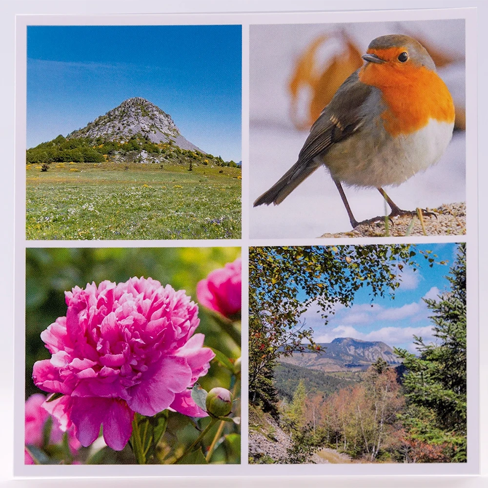 Deux sites emblématiques du centre Ardèche : Le Mont Gerbier de Jonc & Le Mont Mézenc, un rouge-gorge en hiver et une pivoine rose éclatante. Une carte à envoyer ou offrir ou conserver comme souvenir de vos vacances.